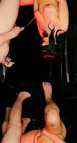 Blindfolded red dress fun as ebony beauty Boricualovenyc gets licked and climaxes at the music party orgy