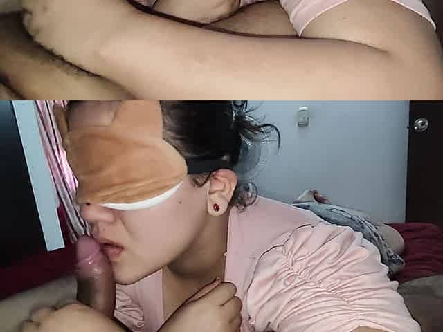 Blindfolded teen feasts on my dick like an angel