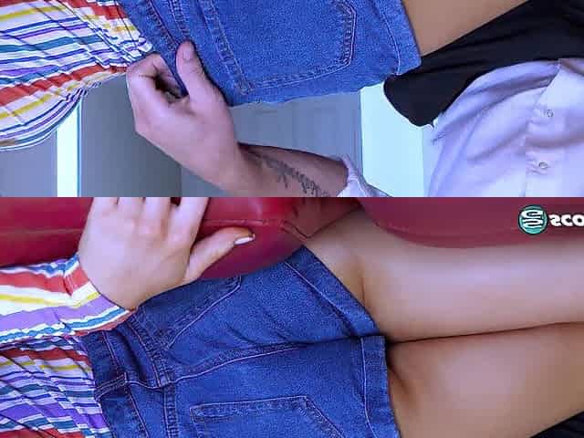 Curious teen Juliette Mint is a blond hotty who explores each inch of our man's thick schlong.