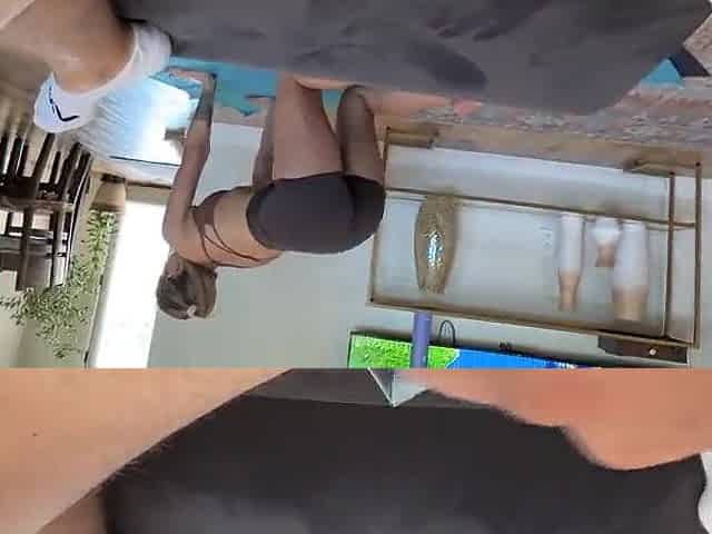 Lengthy Footjob in Shiny Ebony Hose – POV with Spunk flow on Her Nylon Feet