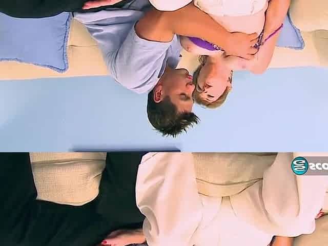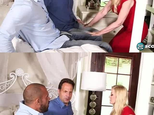 Blonde bombshell takes on two guys in steamy mmf threesome