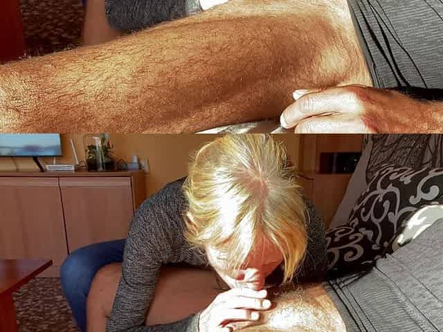 Aged blond fingering her cunt and sucking a hard rod
