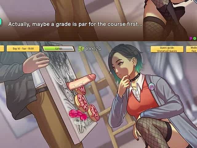 Hot platinum-blonde teacher gives art lessons and unexpected blow jobs in this hentai adventure
