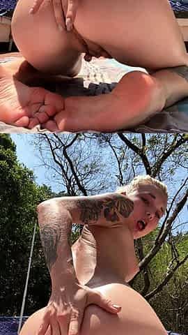 Outdoor anal solo and masturbating blonde