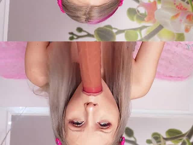 Cute Blond with Natural Melons sucks a large pink sex-toy and drools