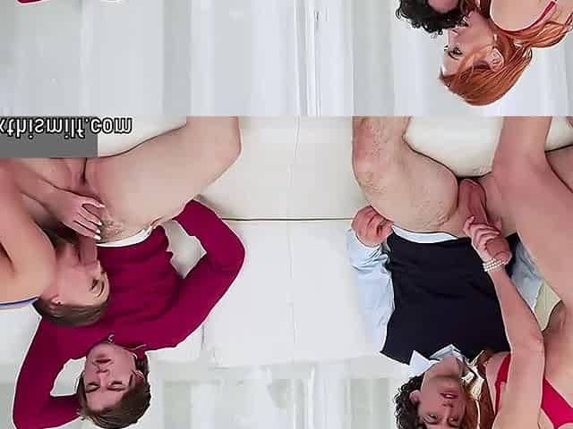 Blonde in glasses Eliz Benson fucked by two huge dicks in the bedroom
