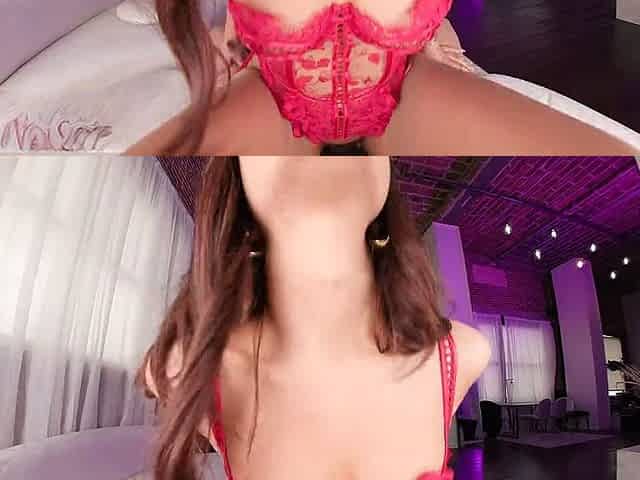 Sexy brunette August Skye in red lingerie gives you a blow job and takes it from behind
