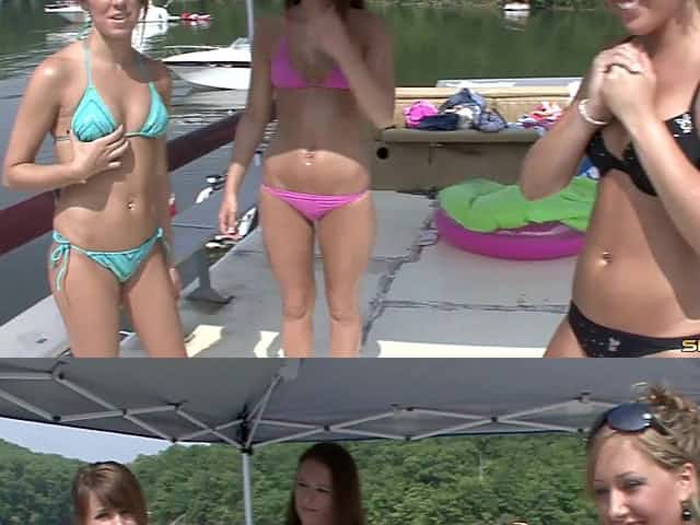 Boat party on a lake with lots of amateur flashers in bikinis