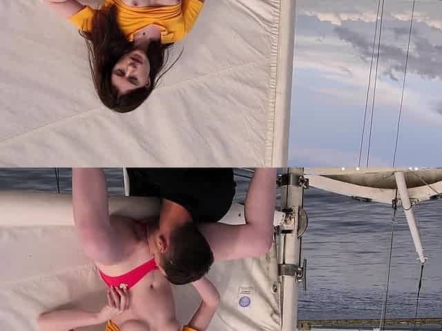 Two beautiful teen with big tits having threesome with hot muscular guy on a big boat
