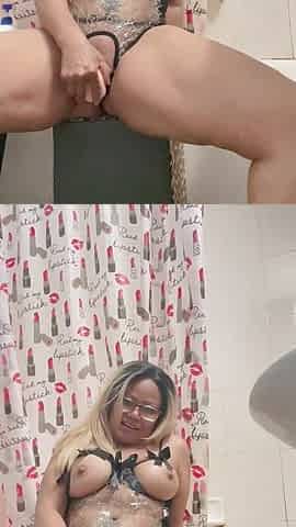 Curvy Latina BBW with voluptuous breasts teases in black fishnet lingerie, pleasuring herself