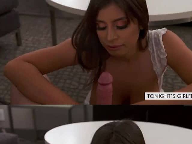 Shapely Latina bimbo in a sexy body stocking works on a big cock