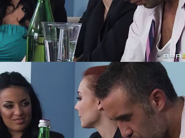 This workaholic tart in fishnet bodystocking blows two cocks at once