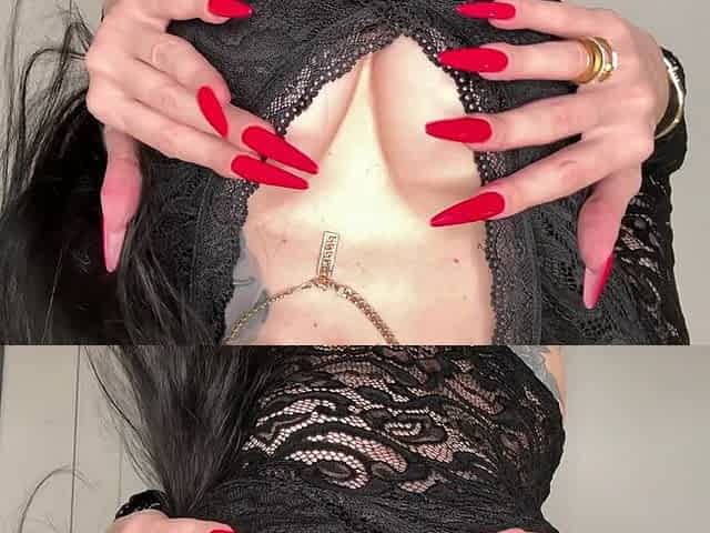 Bright Red Long Nails, Finger Sucking, Black Lace Lingerie Face and Long Fingers Fetish