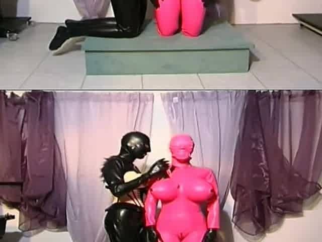 Heavy rubber masked latexgirl stretched and tickled