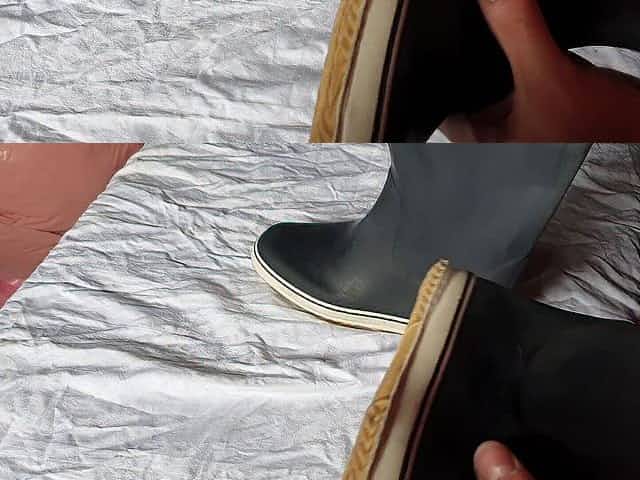 Hottie In High Latex Boots Fills Shaved Slit With Long Dildo
