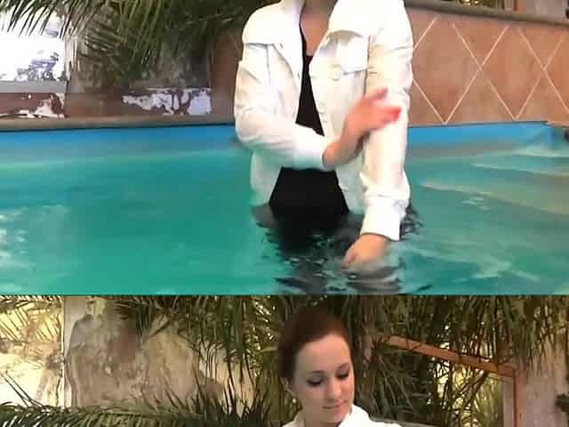 Girl play in pool in jacket and boots