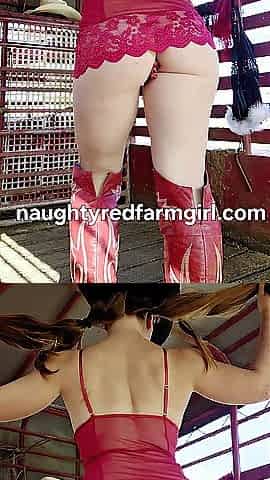 Redhead cowgirls trys on Christmas underware outside in boots
