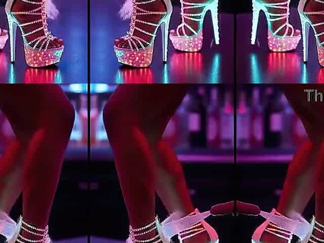 Sexy Beauties stands in High-Heels on a counter in a nightclub. Lots of cum on legs and schoes. Lengthy Legs