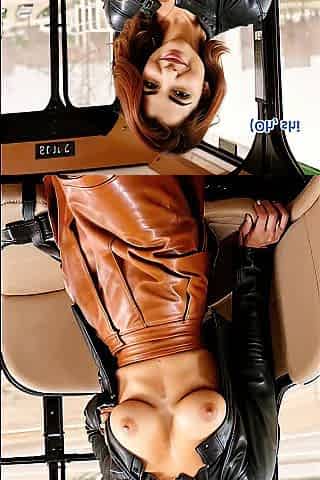 Breasty aged redhead in full leather doing pole dance in a bus - AI Illustrated leather porn fantasy