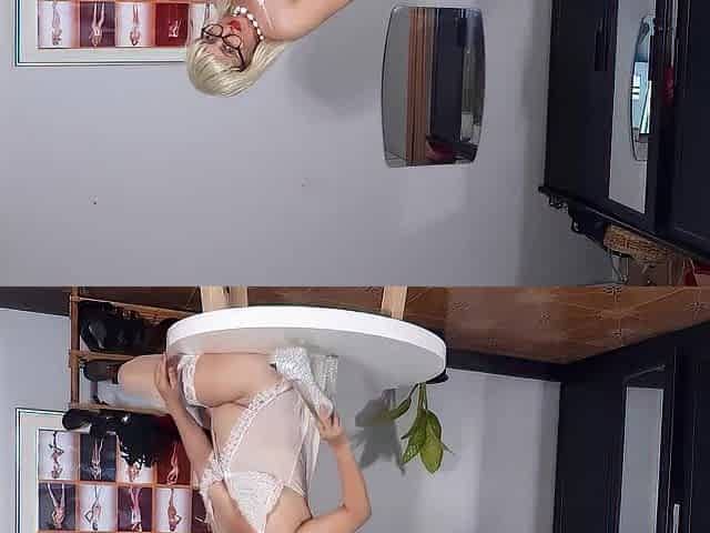 Regina Noir trying on high heels. Striptease in white underware and nylons 5