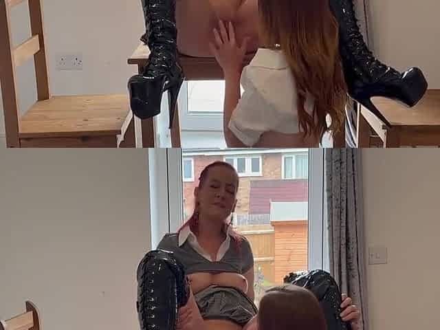 Deepthroat in a leather mini-skirt and boots, enjoying lovely doggy style as the reward
