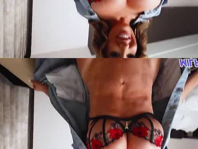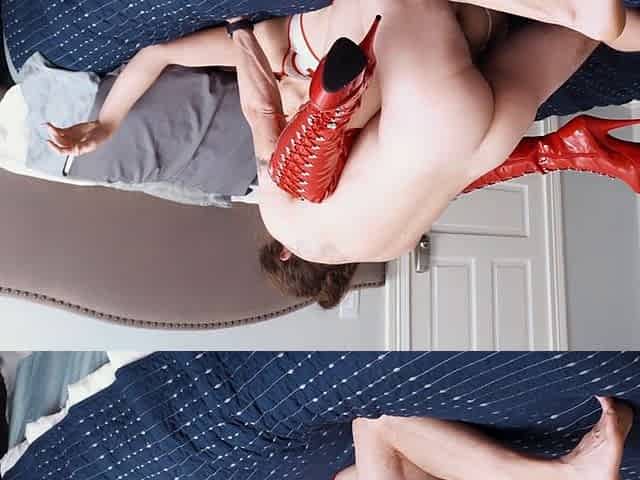 POV penis sucking, deepthroat Blond in Boots, fishnets, corset and red pvc dress