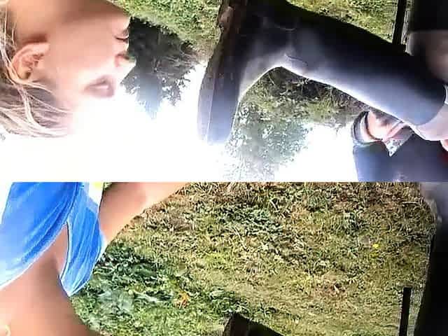Busty Ebony babe in high heel boots fingering pussy outdoor