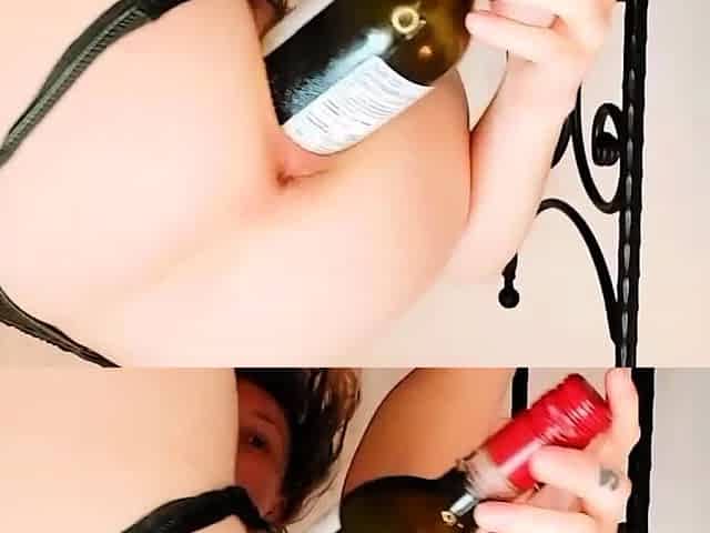 Lewd teen bangs her constricted vagina with an empty wine bottle