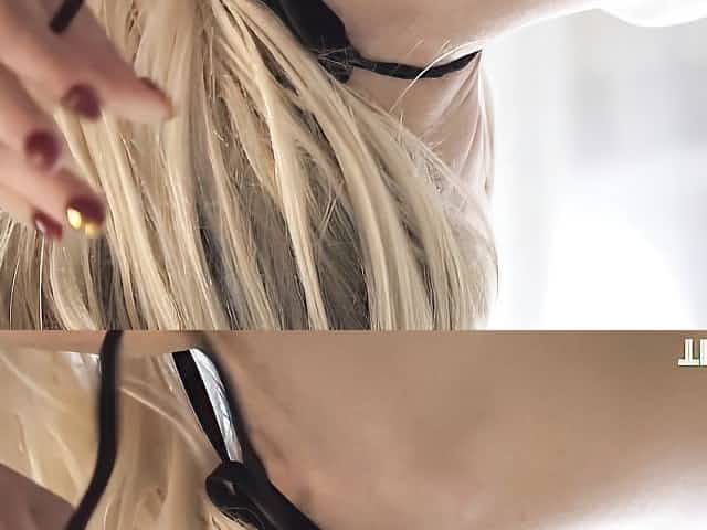 Solo blonde in a black outfit is using a bottle on her pink pussy