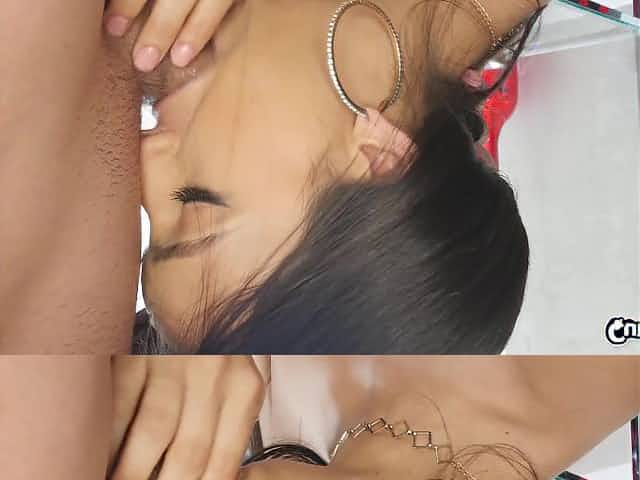 Latina babe Sativa Rose on her knees giving a blowjob