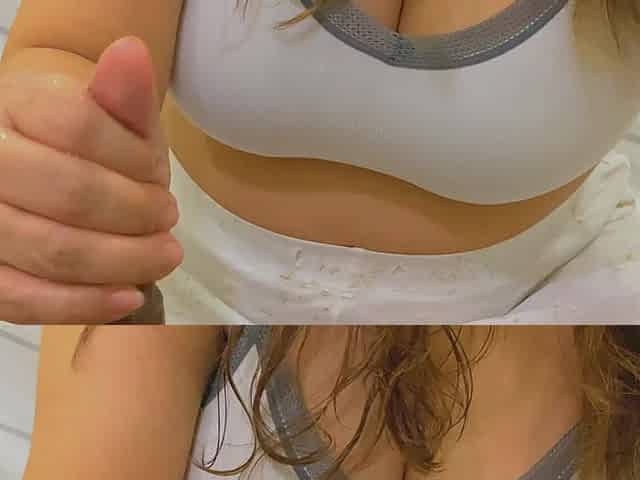 Naughty Stepsister Made Me Watch Her Big Tits in Tight Sports Bra While She Gave Me Oily Handjob and Make Me Cum for Her