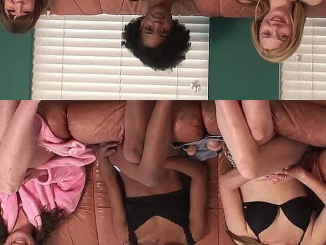 Interracial lesbian threesome on the sofa with hot chicks