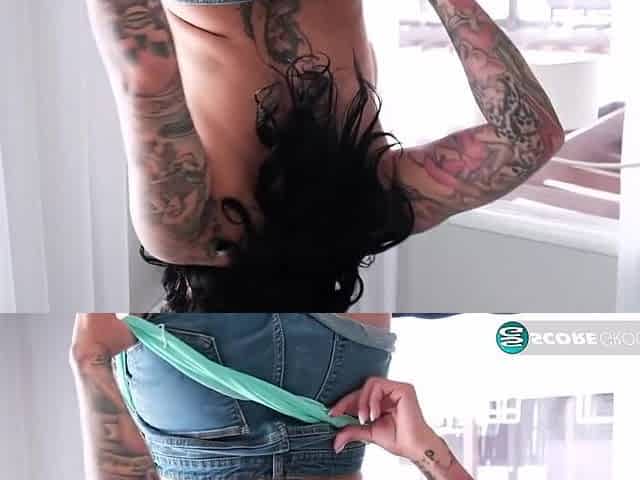 Tattooed Dollie Darko wearing glasses having fun in the backstage