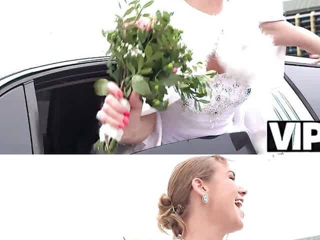 VIP4K. Sexy bride in white dress moans loudly while getting fucked in the wedding limo