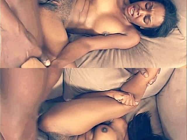 Beautiful ebony babe pleasures herself with a huge cock through oral and penetration