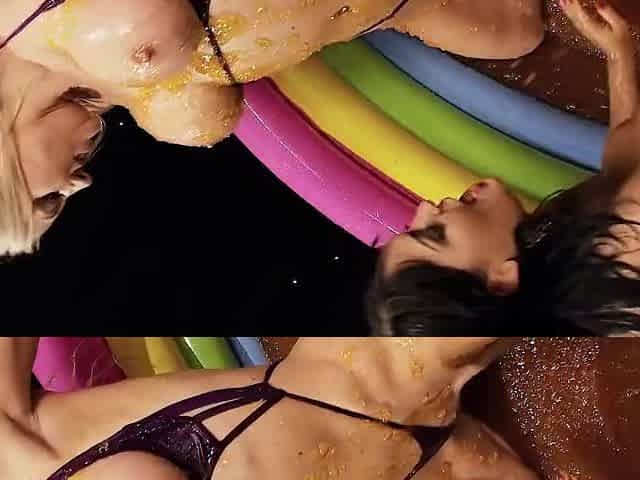 Very sloppy but seductive lesbian sex in a pool filled with jelly between two horny British bitches
