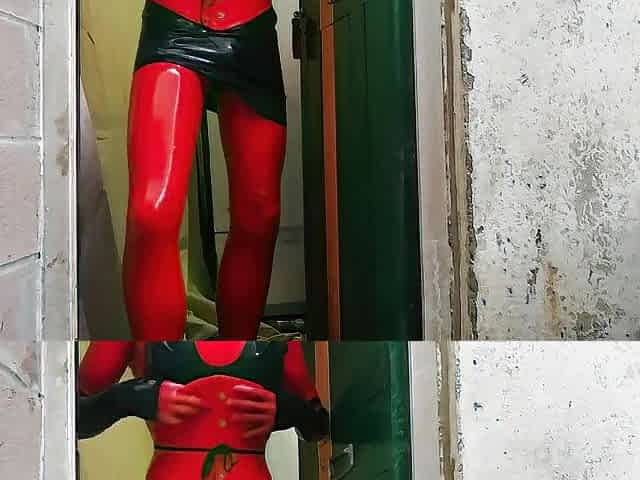 Alison the bawdy latex wench overspread in rubber in the storeroom at work