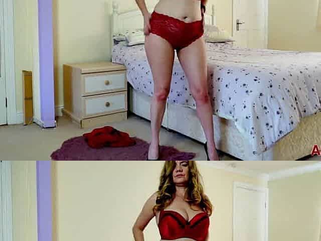 A sophisticated, older female office assistant pleasurably excites herself while wearing alluring undergarments.