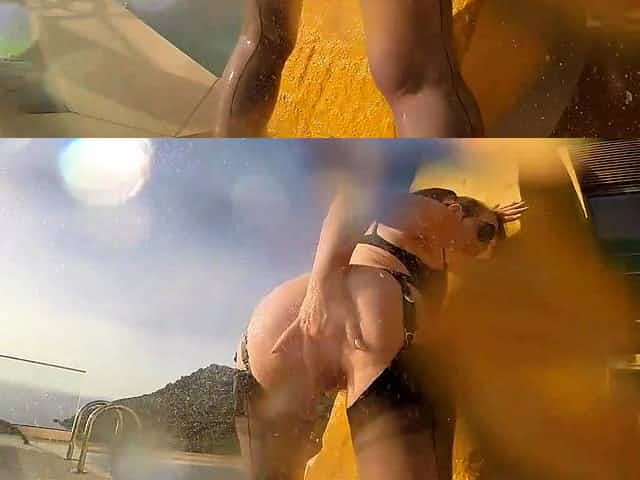 Sexy mature Red XXX masturbates outside by the pool