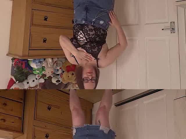 wife striptease in denim miniskirt and lace underware