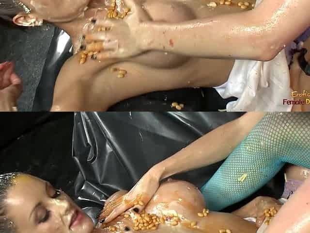 Brunette hair honey likes smearing food all over a breasty golden-haired sweetheart