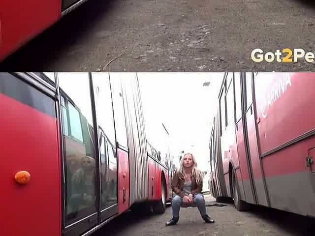 Hot Blonde Pees Between Two Buses