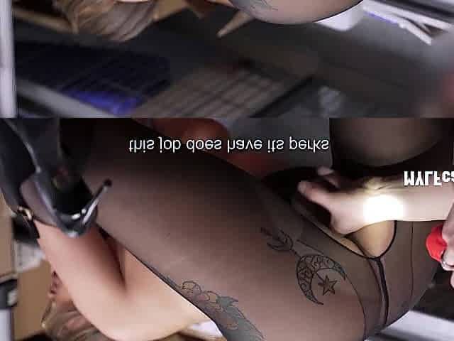 serious business woman in hot leatherskirt and pantyhose bootjob to bosses dick