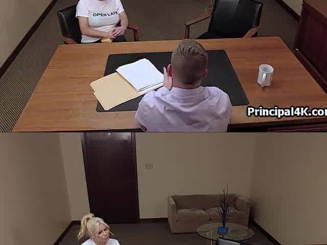 serious business woman in sexy leatherskirt and hose bootjob to bosses knob