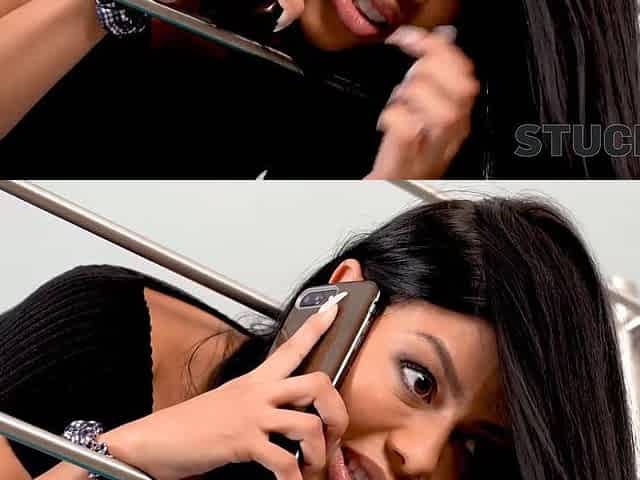 Hot Ebony stepmom in glasses likes to fuck her pussy while her stepson watching