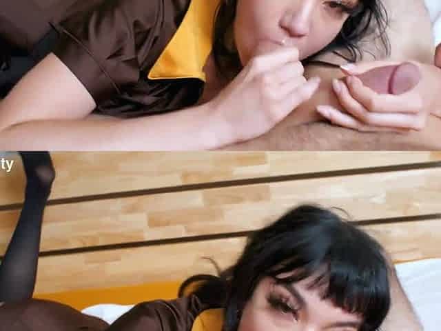 Big tit brunette sucks a big cock POV