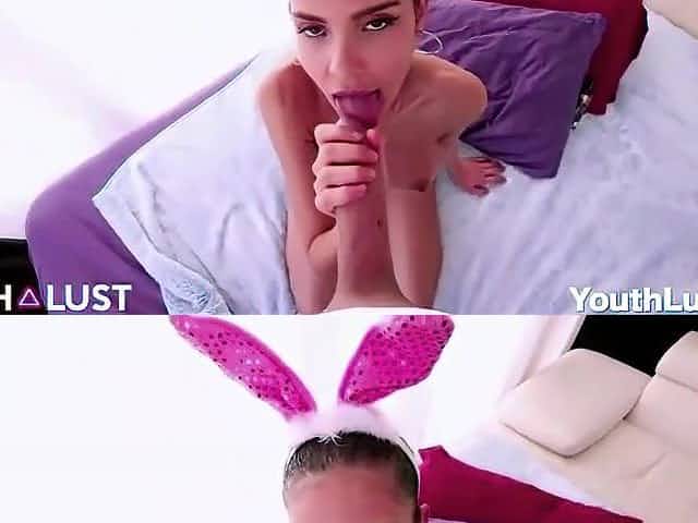 Skinny teen with tiny melons is sucking shlong and getting screwed whilst making her 1st porn movie