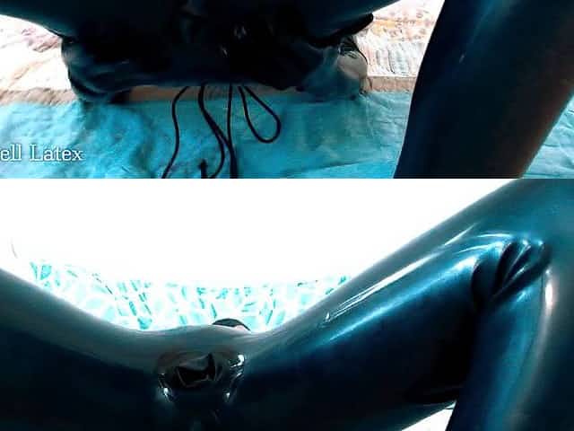 Latex Full Enclosure, Double Plugged with Inflatable Sex Toy and Buttplug