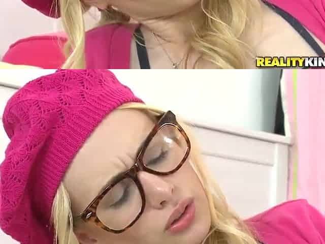 Provocative petite pale nerdy blonde teen Kennedy Kressler with kinky glasses and tight body gets her shaved tight minge licked