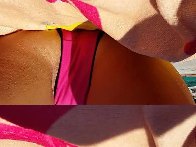 Gf opens legs – bikini slip, pussy hairs and cameltoe at pool